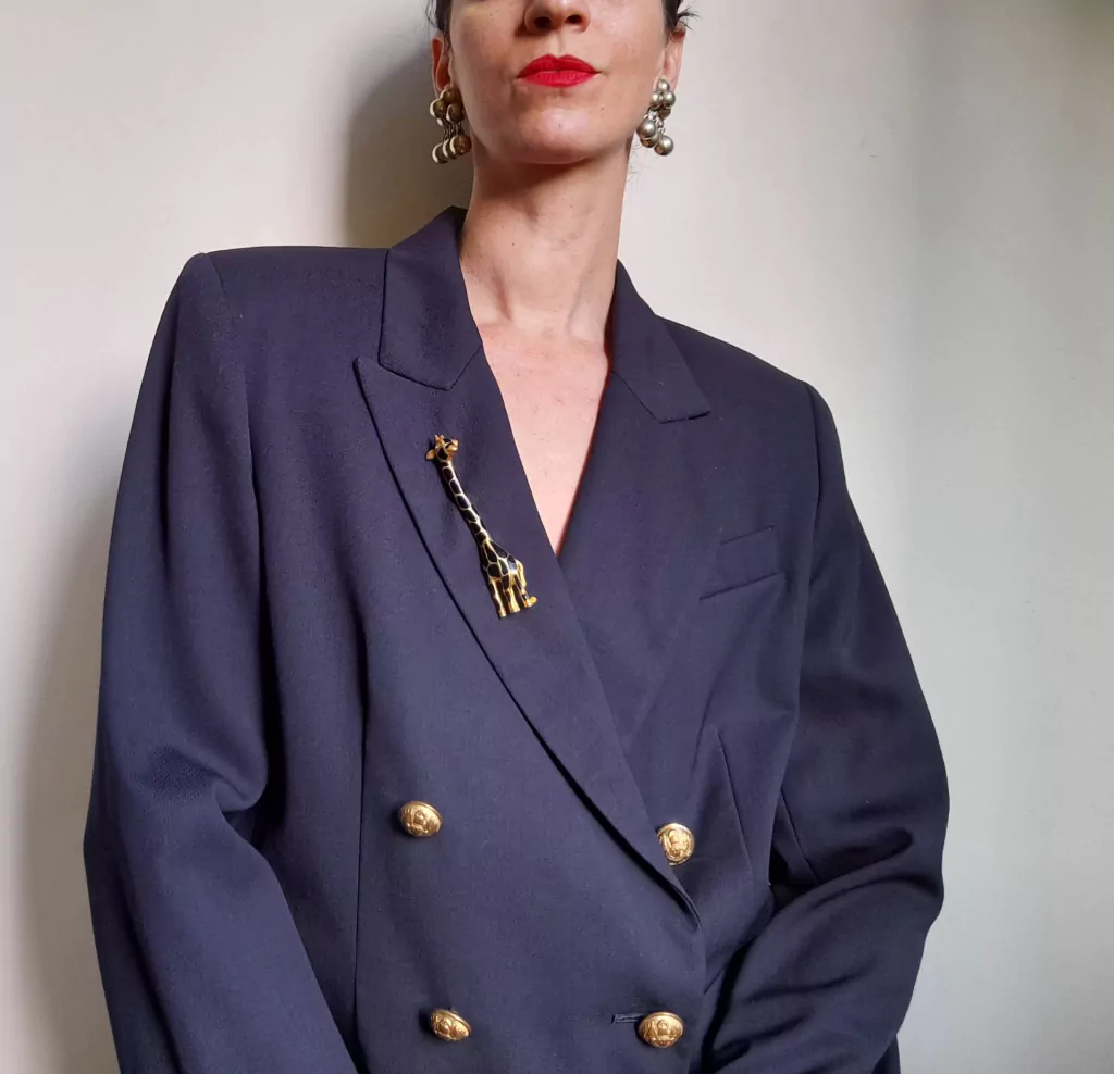 Blazer vintage azul marinho, vom ombreiras, corte impecável e abotoamento frontal com seis botões dourados com brasão da marca americana Anne Taylor.