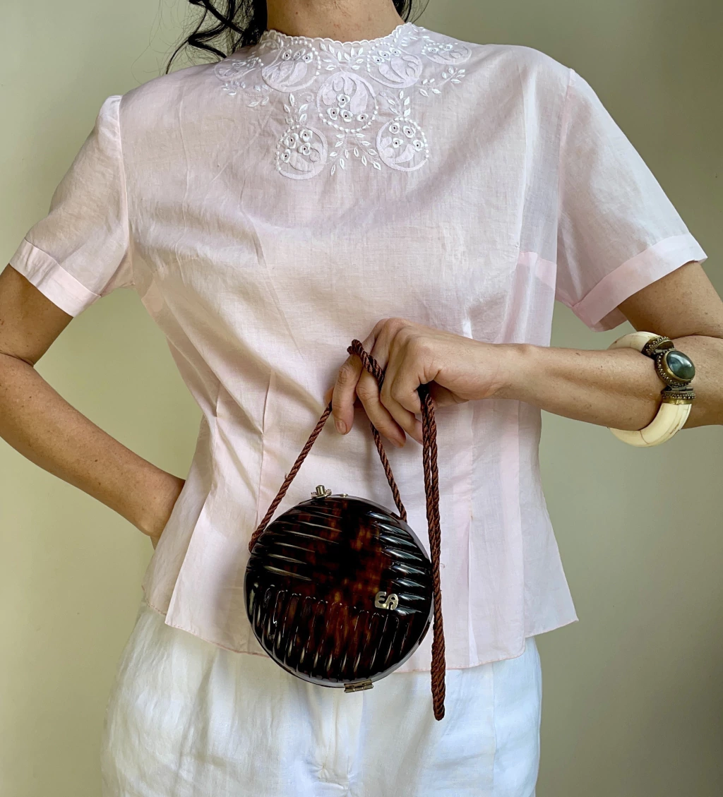 Bolsinha vintage em baqueite tipo tartaruga contextura.