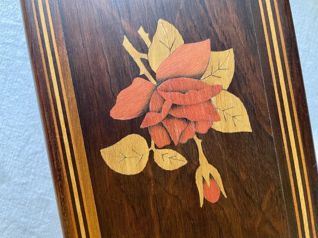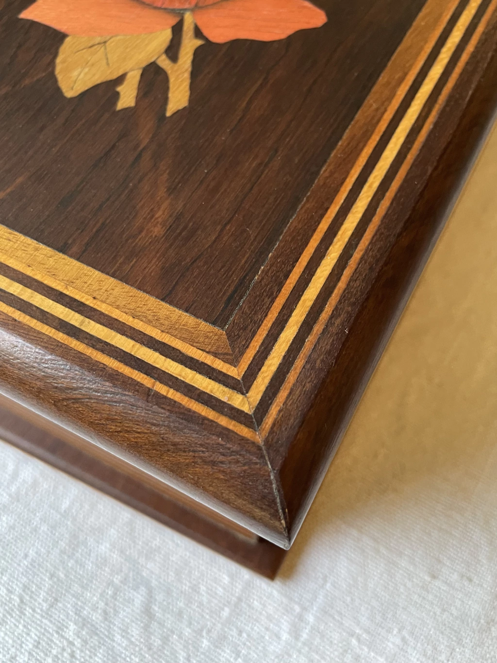 Linda e delicada caixa em madeiras nobres e com minucioso trabalho de marchetaria.