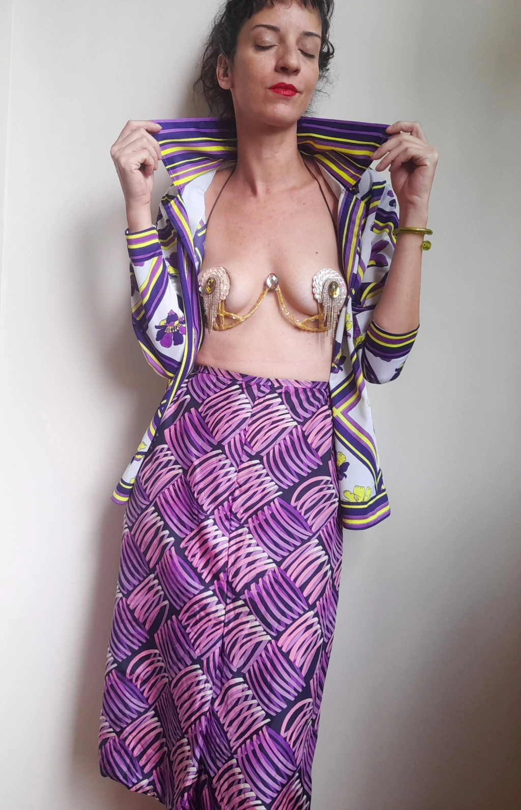 Linda camisa vintage anos 70 nessa padronagem de estampa e cores vibrantes de roxo com verde...