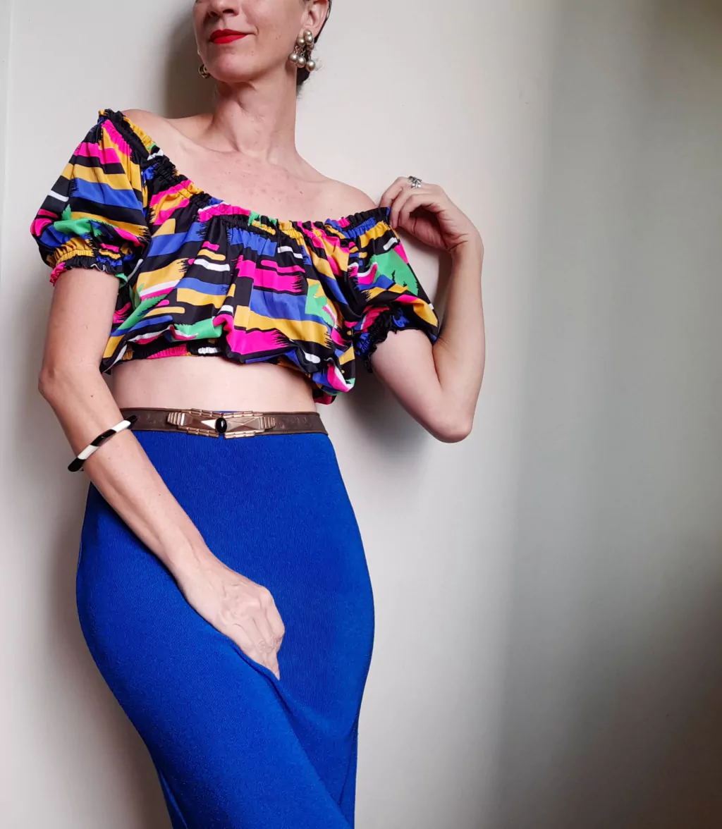 Top cropped vintage anos 80, modelo ciganinha com elastico nas mangas, no decote e na barra.