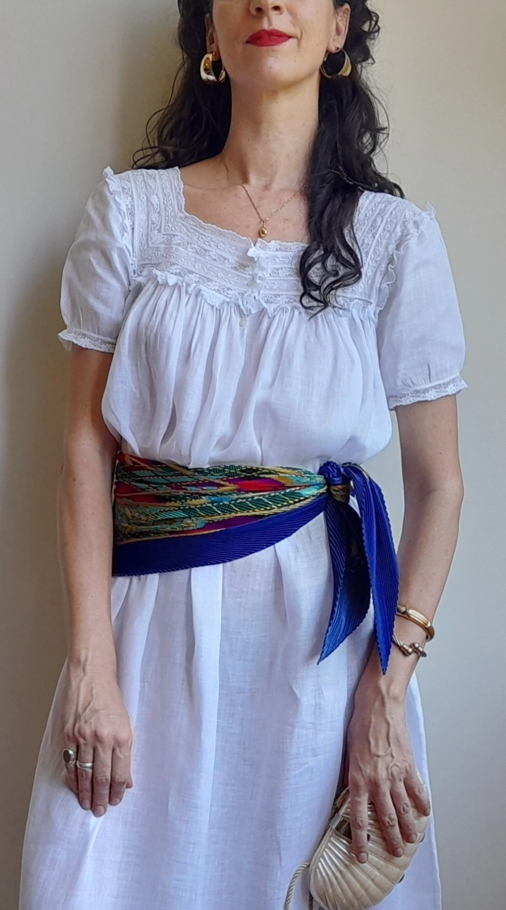 Lenço vintage com estampa colorida e vibrante e bordas azul.