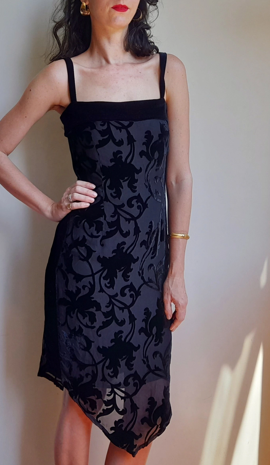 Vestido anos 90 Daslu. Em veludo devorê fino com motivo de flores, forro tambem fino.